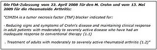 Im Unterschied zur europäischen Zulassung ist nach dieser Zulassung in den USA die Anwendung von Cimzia als „First-line-DMARD“ möglich, d.h. bereits als erste krankheitsmodifzierende Substanz und nicht erst nach dem Versagen von anderen, konventionellen DMARDs.